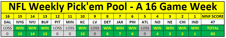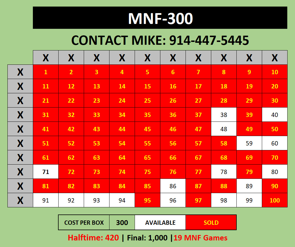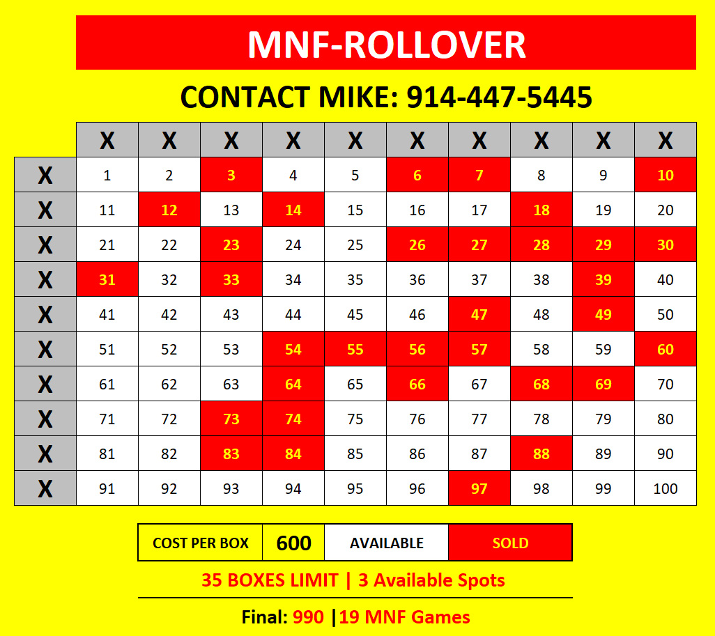 Monday Night FootballWe are running multiple pools for MNF. First off will be the regular pool where we fill all boxes then our rollover pool which will max out at 35 boxes sold each. Here are the rules for each pool: ![]()